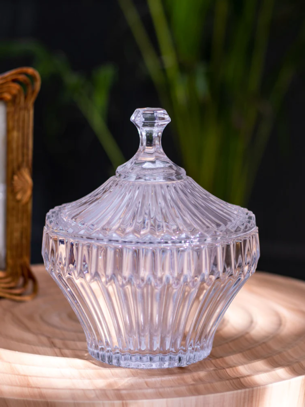 A stylish and elegant way to store your favorite candies. This crystal glass jar is made from high-quality glass and features a simple yet classic design. The clear glass allows you to see your candies inside, and the gold rim adds a touch of luxury.