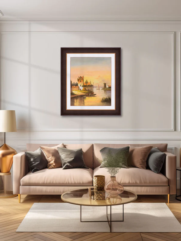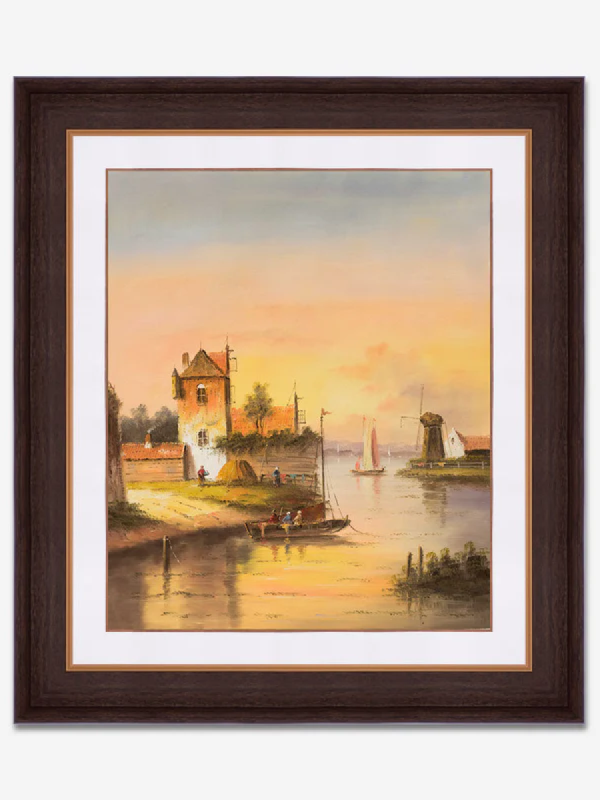 This is a beautiful handmade oil painting depicting a scene of a Dutch landscape with a windmill. The painting is done in a realistic style, and the artist has captured the details of the windmill, the landscape, and the sky.