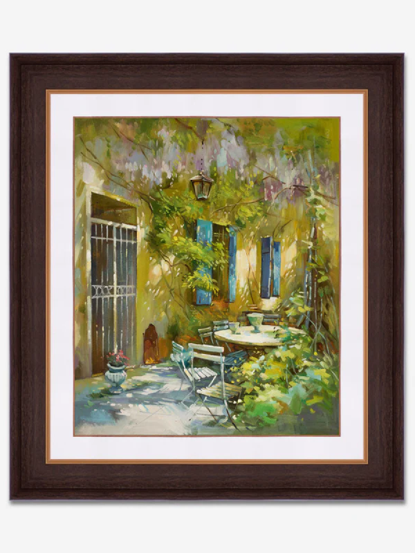 This is a beautiful handmade oil painting depicting a landscape of mountains, trees, and a river. The painting is done in a realistic style, and the artist has captured the details of the landscape.