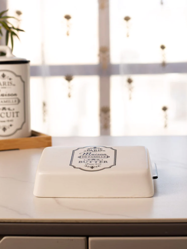 Paris Maison De Famille' Butter Dish is a stylish and functional way to keep your butter fresh and protected. Made from high-quality ceramic with a white glaze and distressed finish, this butter dish features the words "Paris Maison De Famille" in black lettering.