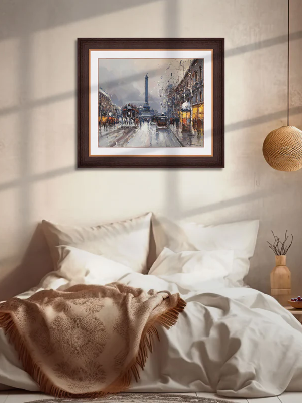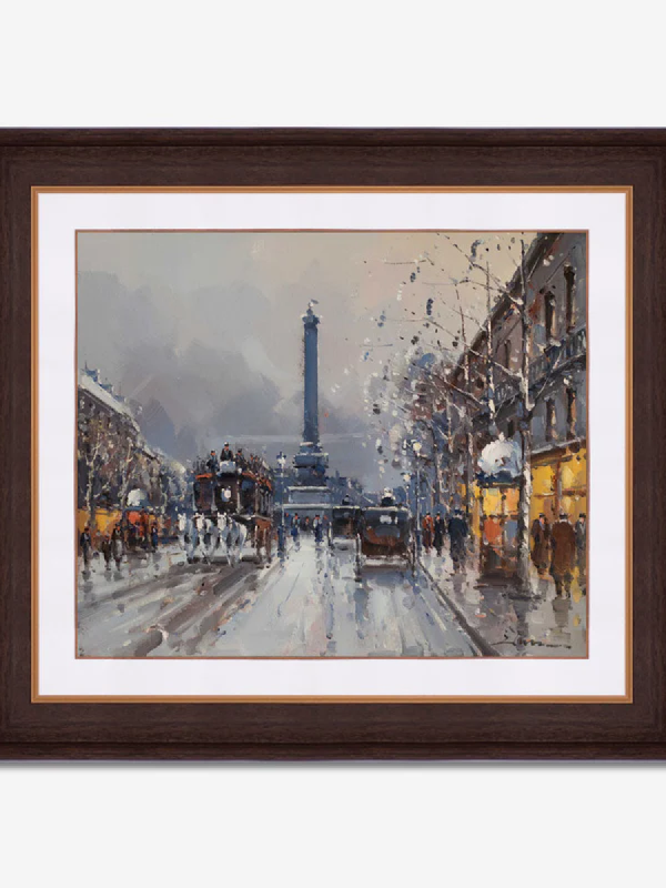 This is a beautiful handmade oil painting depicting a scene of Place de la Bastille in winter. The painting is done in a realistic style, and the artist has captured the details of the square, the buildings, and the people.