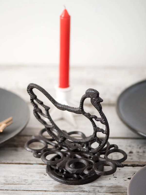 A stylish and functional way to store or display your eggs. This cast iron egg caddy has a rooster as its handle that allows for easy maneuverings around the kitchen, dining room, or entertaining space. It's a true farm-to-table addition for any kitchen.