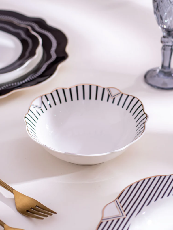 This 24-piece dinner set is made from high-quality porcelain and features a sleek black and white design. The simple lines and classic colors make it a perfect choice for any occasion.